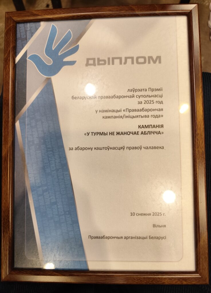 Прыемная навіна прыйшла на гэтым тыдні: зладжаная праца нашай дружнай і прафесійнай каманды атрымала высокую адзнаку праваабарончай супольнасці Беларусі. 10 снежня, у Міжнародны дзень правоў чалавека, стала вядома, што ініцыятыва “У турмы не жаночае аблічча” прызнаная пераможцай ў намінацыі «Праваабарончая кампанія/ініцыятыва года-2025».