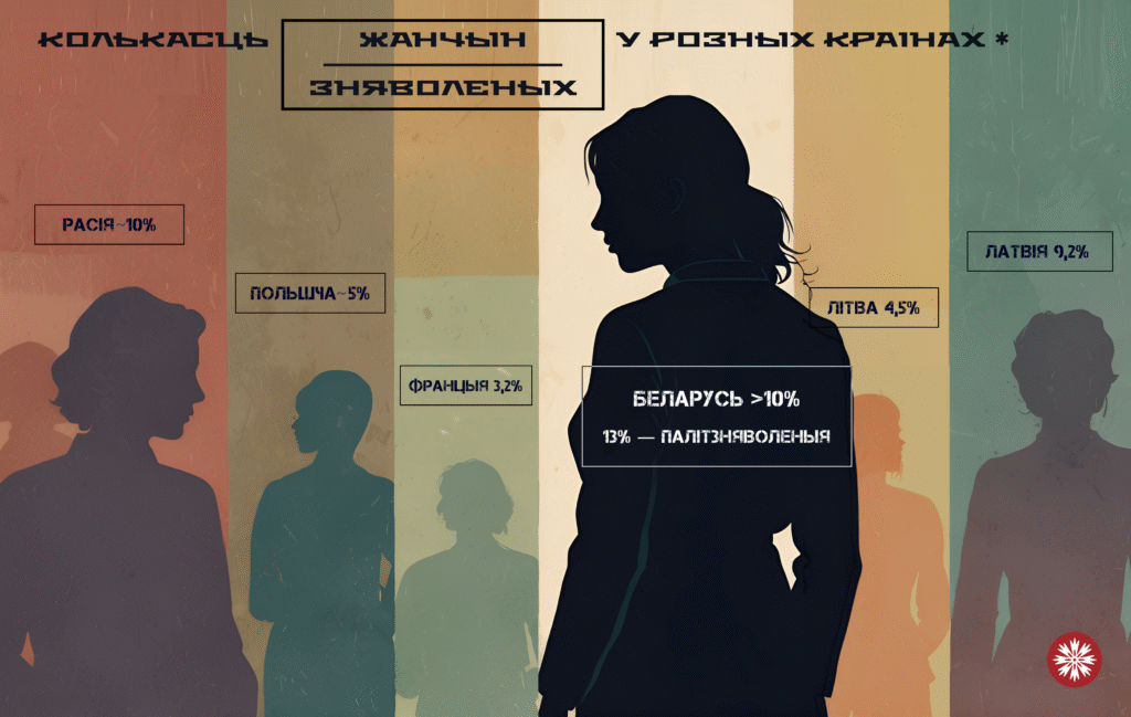Для параўнання, у суседніх Еўрапейскіх краінах сітуацыя выглядае інакш. У Літве жанчыны складаюць толькі 4,5% ад агульнай колькасці зняволеных, у Польшчы – каля 5%. Нават у Расіі гэты паказчык быў крыху ніжэйшы (10% па стане на 2019 г. – заўв.), а ў Францыі – усяго 3,2%. Беларусь па долі жанчын у зняволенні апярэджвае большасць Еўрапейскіх краін, саступаючы толькі Андоры. Там адсотак асуджаных жанчын склаў 11,5%.
